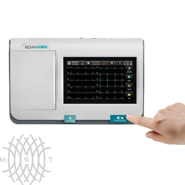 EDAN SE-301 — ультралегкий портативный трехканальный электрокардиограф с 5-ти дюймовым сенсорным экраном с весом менее 1 кг. Компактность прибора никак не влияет на высокое качество исследований, ведь небольшой корпус скрывает множество возможностей и функций.