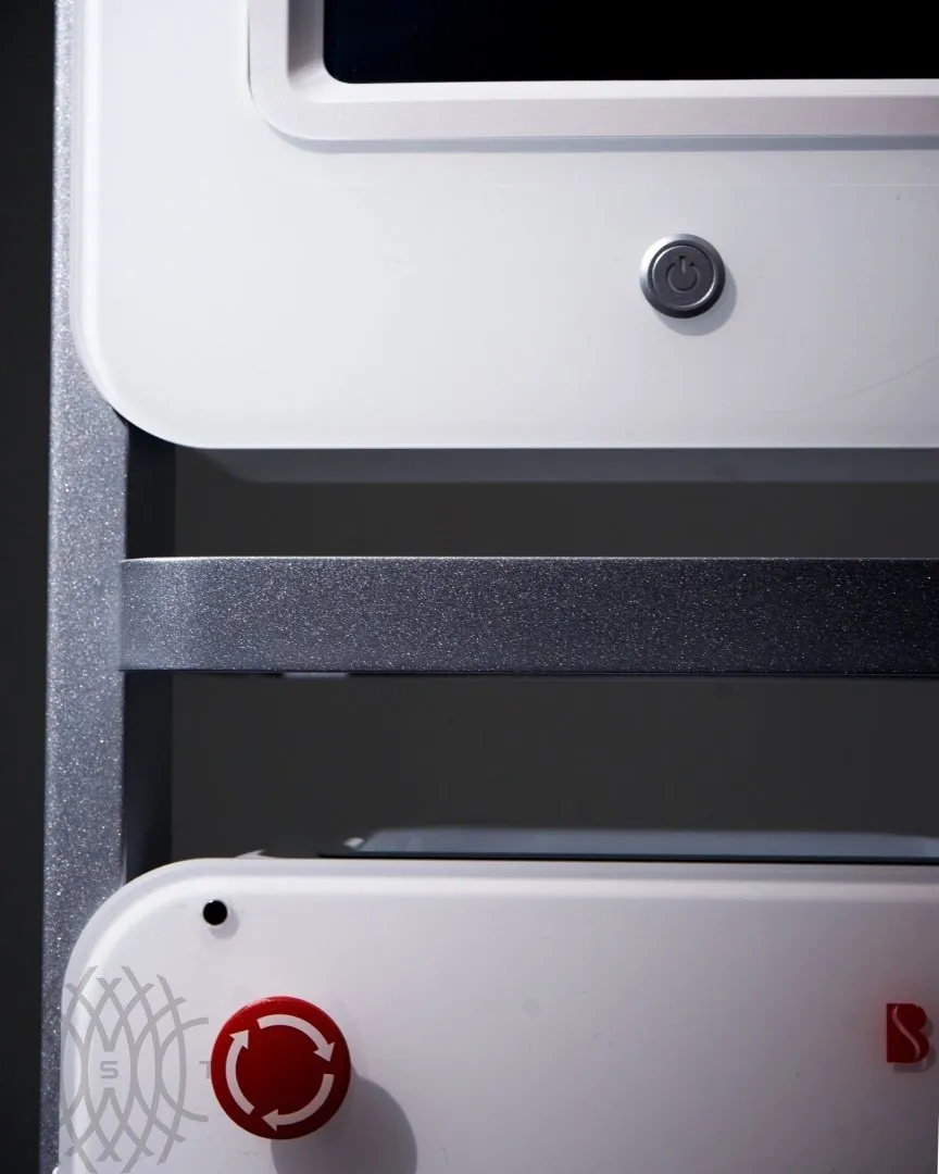 - Манипула: Кнопка на манипуле активирует выдвижение насадки с микроиглами. Манипула оборудована красными (760 нм) и синими (470 нм) светодиодами для вспомогательной светотерапии, которые также удобно использовать для контроля проведения процедуры (активируются в момент выдвижения микроигл)